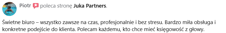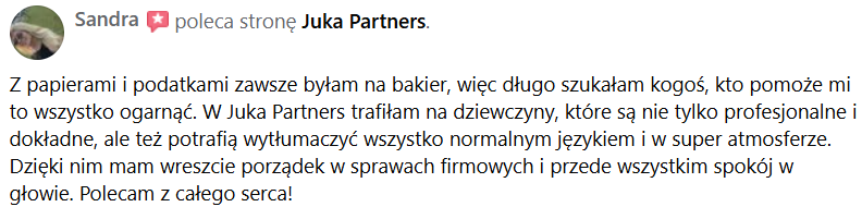 W Juka Partners zajmujemy się Twoją księgowością od początku do końca. To oznacza, że nie tylko księgujemy faktury, ale dbamy o całą otoczkę formalną, która pozwala Ci spokojnie prowadzić biznes.